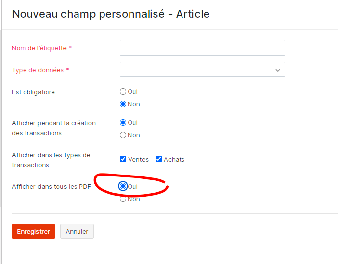 1. Aller aux Paramètres - Préférences - Articles - Personnalisation des champs - + Nouveau champ personnalisé