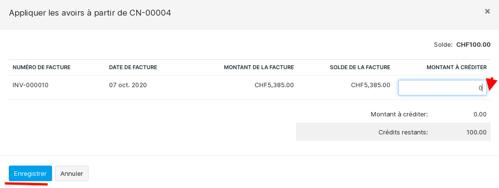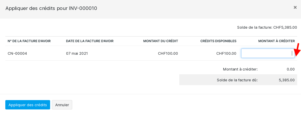 Appliquer à une facture à partir de la note de crédit