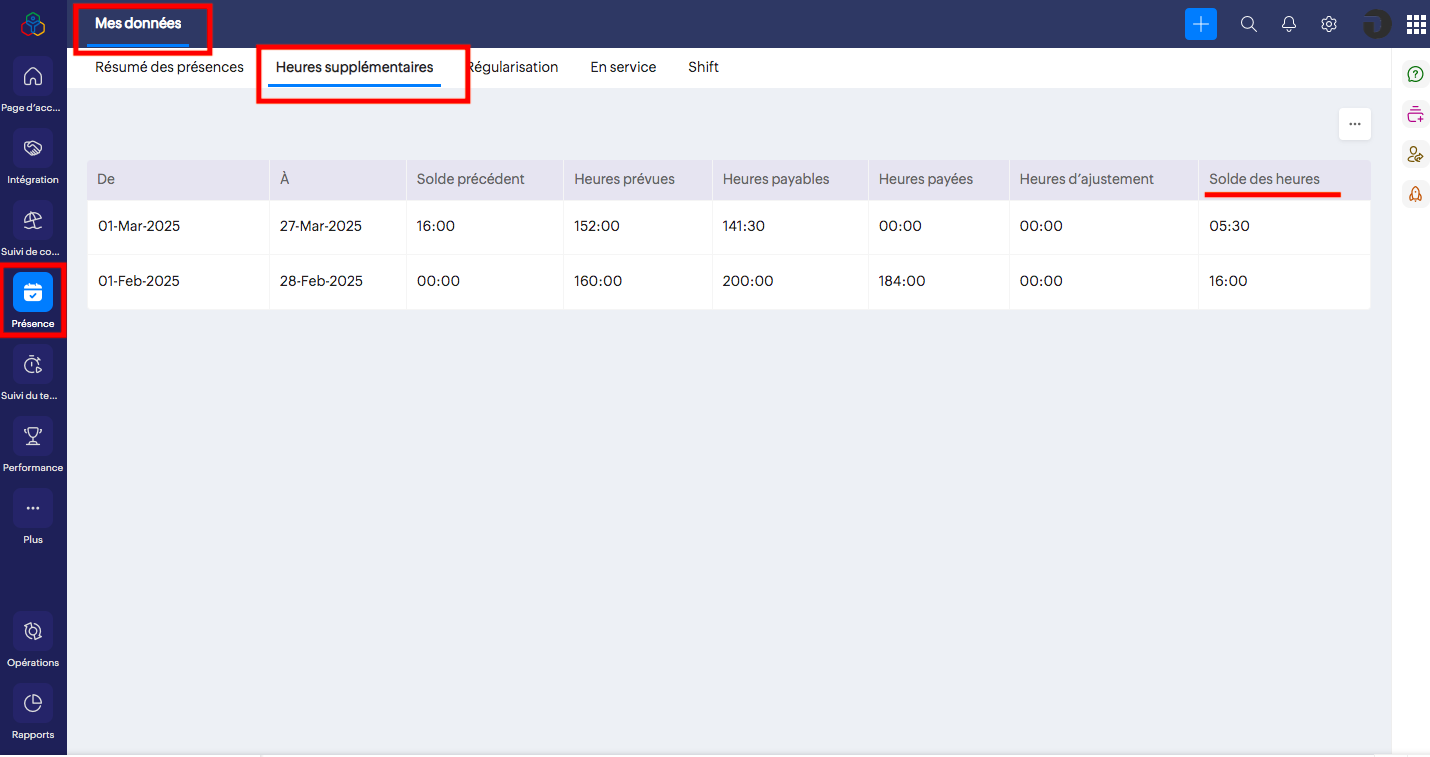 Chaque employé pourra consulter son historique d'heures supplémentaires à tout moment :